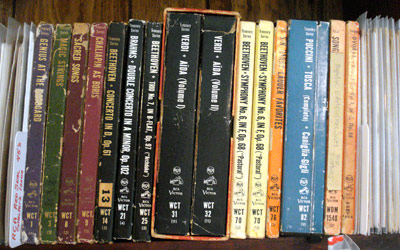 When RCA Victor released the first 7" 45s in 1949, the company attempted to compete with Columbia Records for possession of the classical music market. Columbia had invented the 33-1/3rpm LP record, the superior format for classical music. Thus, the market was won by Columbia. During this period of competition, RCA Victor released classical music as box-set albums of 45rpm red-vinyl records. In this photo we see some of the 45rpm classical music albums that had been released on RCA Victor during the early years of 45rpm records. Note the size of some of the opera sets (Tosca and Aida). They contained many individual records, while an LP counterpart on 12" records would have contained only a few.