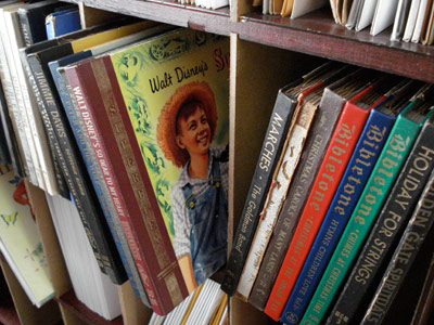 Mary Ellen is looking through one of the early Disney children's 45rpm record albums from 1950. In addition to various children's stories, music from the Disney movies was featured along with narration and a colorful story book that kids could read while listening to the records. RCA Victor 45rpm children's albums contained yellow vinyl records.