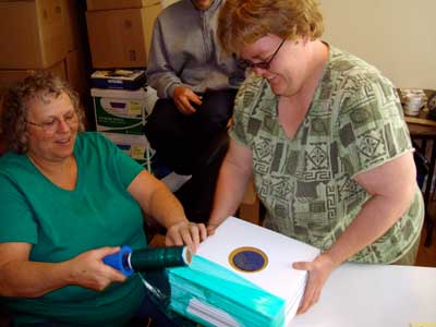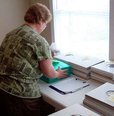 Mary Ellen and Heidi are preparing batches of 78rpm records to be placed into storage cartons. 78rpm records break easily and must be carefully handled when they are being prepared for storage.