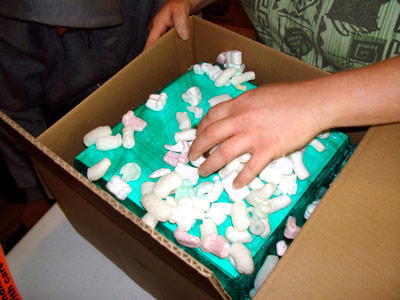 Stacks of 78rpm records were placed inside storage boxes and surrounded with styrofoam pellets.