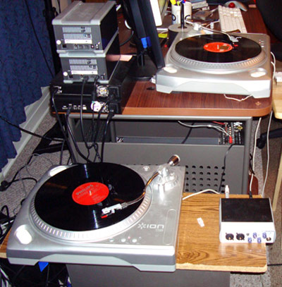 These two record turntables connected directly to the computer via its USB port. A stack of disk drives held the computerized recordings that had been recorded from the turntables.