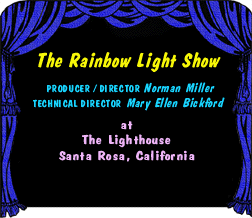 Mary Ellen: "Norman Miller and I had rented a beautiful home in Santa Rosa, California where we would carry out the work of Rainbow Research, Inc. and present our increasingly popular multi-image shows. We called our new home the Lighthouse. For the shows, we hung a 9' x 9' rear projection screen in the archway between the living room and dinning room and created a theater environment with lots of chairs, pillows, and walls that were covered with original paintings and prints by the artists whose work we used in the shows."