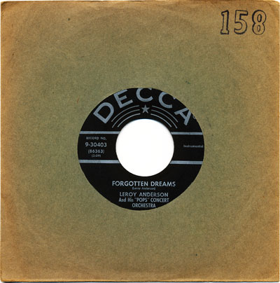 About 1950, Denver band leader Milton Shrednick opened a record shop on East 8th Avenue, about a mile from my home. I went there any time that I was able, and I probably drove poor Mr. Shrednick crazy. In those days you could listen to records in listening booths that every record store provided, and I did just that. I was intent on hearing every record in the store, if possible. The photo above shows one of the classical music promotional records from Columbia that Mr. Shrednick used to give me each month after he was finished with them. Every penny of my allowance went toward buying 45rpm records from Milton Shrednick; LP records were beyond the means of my youthful budget.